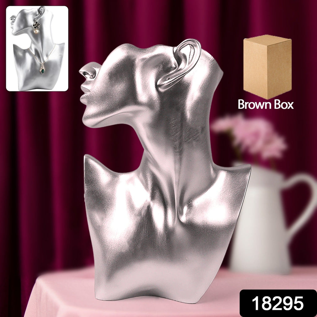 • Contemporary display that emulates the partial face, neck, and shoulders of a woman to highlight necklaces and earrings.