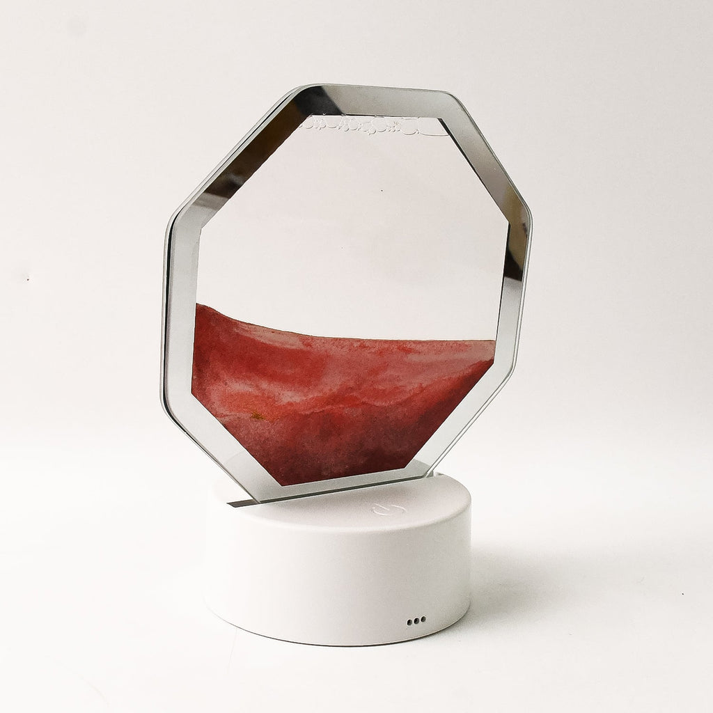Bring a sense of tranquility and creativity to your space with this LED Moving Sand Art Lamp from the Moving Sandscapes Series. Designed with a sleek white base and an octagon-shaped rotating frame, the lamp features dynamically flowing colored sand that creates mesmerizing landscapes with every flip. The lamp is equipped with soothing multicolor LED lights, making it a beautiful night light and visual therapy piece.