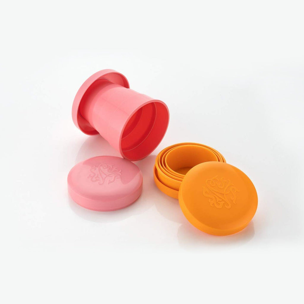 These expandable silicone cups can be collapsed and stored easily in a bag. Each cup includes a lid for storage and to prevent spilling.